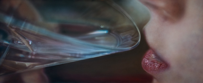 At the end of his garden, his studio is a temporary home to four of six of his latest paintings, the series ‘In a Suspended State’ – at the time of writing, two have already been sold. The series includes In a Suspended State of Happiness, a close-up of a woman’s lipsticked mouth about to sip from a glass of dry Martini. The imminence of the contact between her lips and the elegantly thin bluish glass of the drink is at the heart of the painting; the rest of the detail of the scene slides out of focus. |