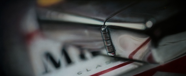 In The Truth Is.... Sometimes I Miss You So Much I can Hardly Stand It, an immaculate vision of a shiny Zippo lighter reflects the iconic black, white and red of a cigarette packet. The sharpness of the focus in the centre and the rushing away of detail into the periphery mean that the painting mimics the panning round of a camera; these are images imbued with movement and a heady intimacy of viewpoint. |